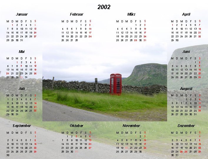 Mit dieser Vorlage kann ein Jahreskalender für ein beliebiges Jahr im Hoch- oder im Querformat erstellt werden. Auf Wunsch werden die deutschen Feiertage eingetragen. Die Vorlage steht für StarOffice 5.2 und 6 zur Verfügung. Ein Klick auf die Abbildung links zeigt eine Vorschau. |